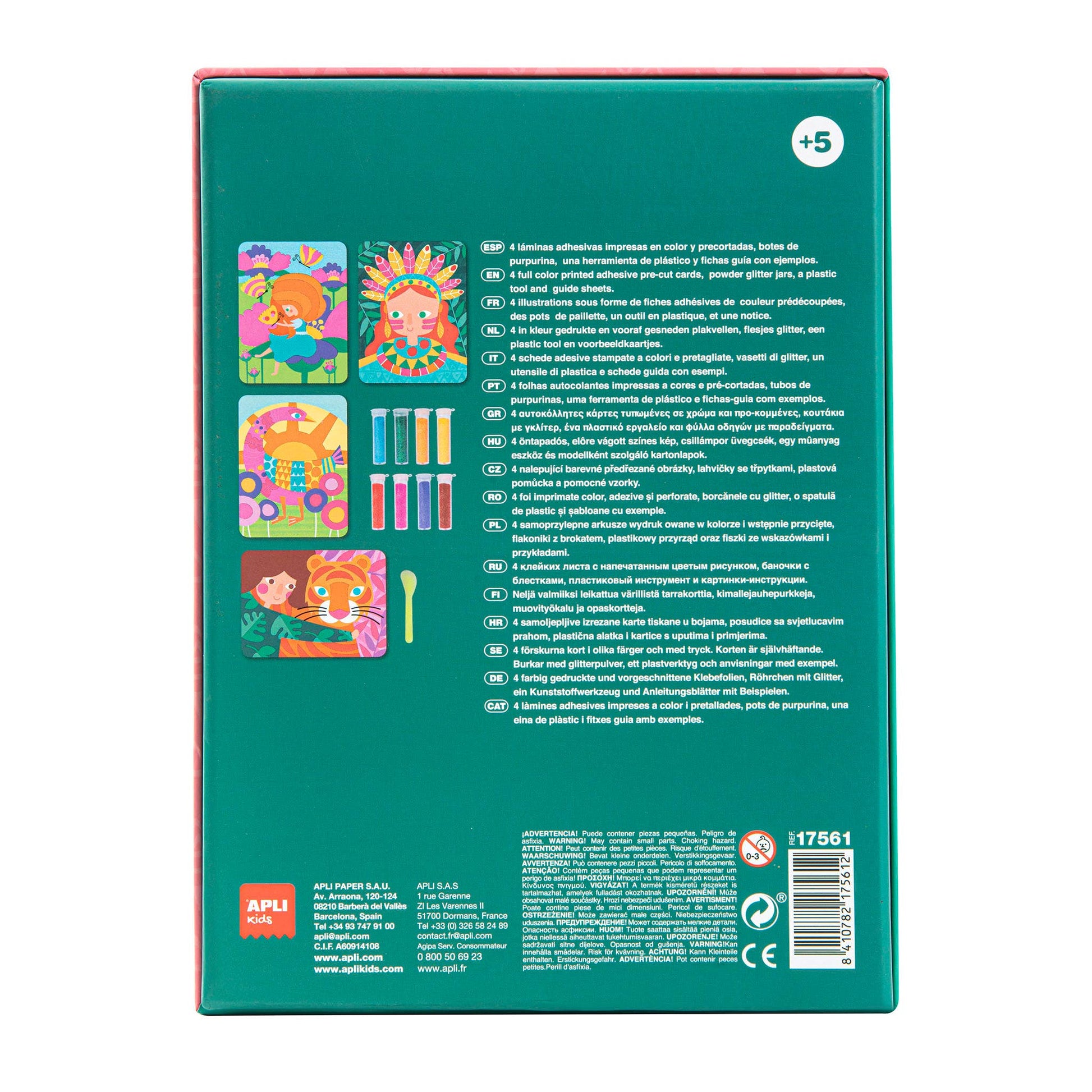8 barattoli di glitter in diversi colori e uno strumento di plastica. Facile da usare: le carte adesive stampate non necessitano di adesivo aggiuntivo.