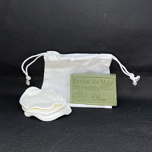 Kit struccante naturale in un sacchetto con coulisse 15x20 cm, 100% cotone 150 g, colore bianco composto da: